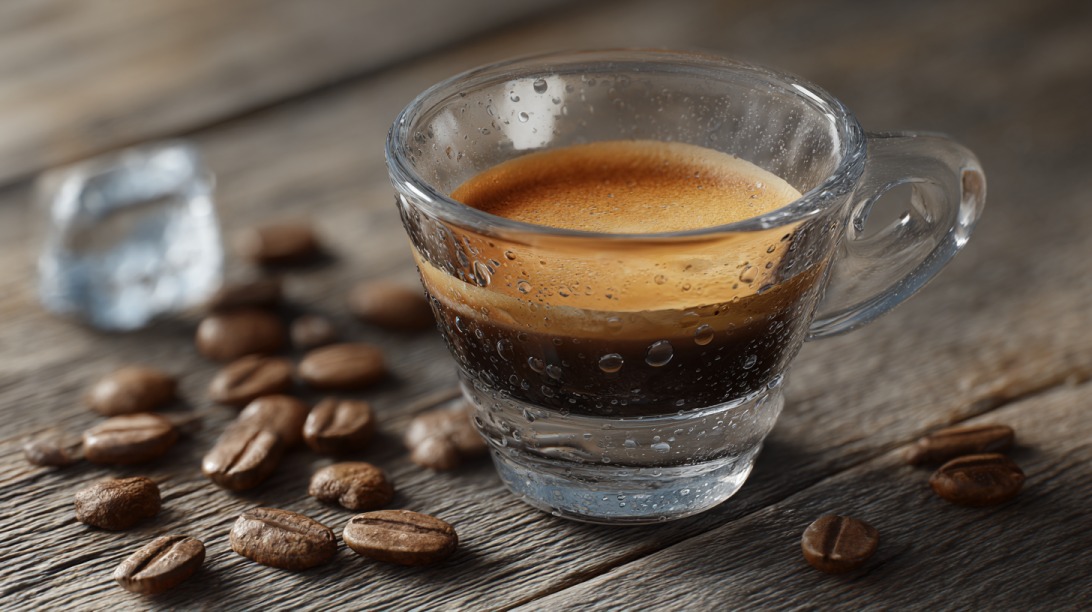 Staklena šoljica svežeg espresa sa kremom na drvenoj površini pored zrna kafe
